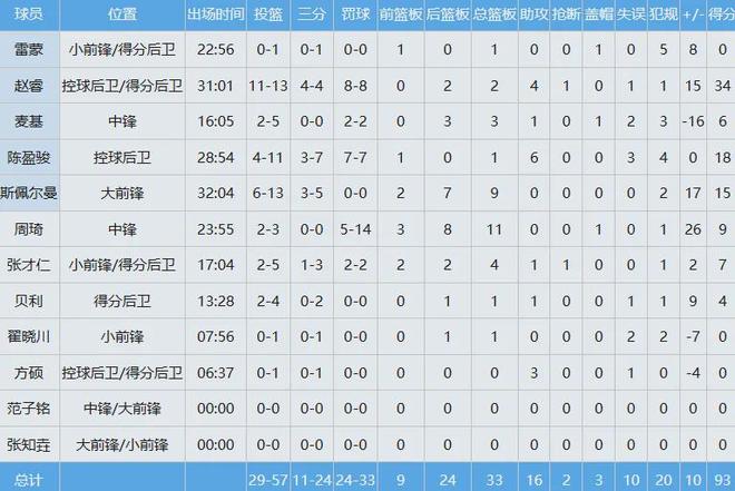 第三节单节5中5独揽14分,最终全场出战31分钟,投篮13中11,三分4中4,罚球8中8爆砍34分外加2板4助1断,正负值+15,带领北京队93-83逆转辽宁队。