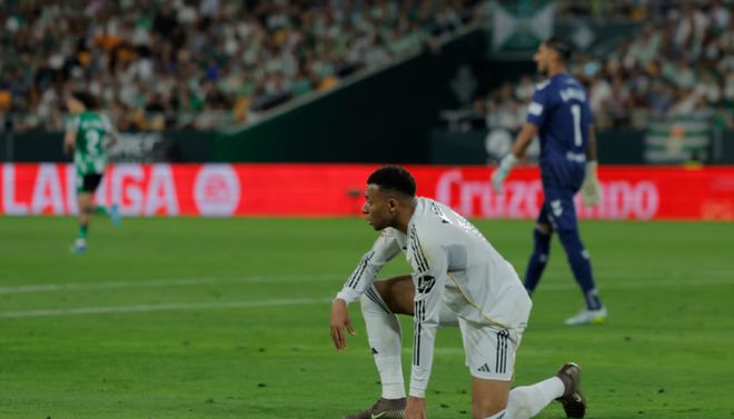 在对贝蒂斯一战,姆巴佩在第81分钟主动要求退场,原因是左腿腘绳肌肌肉超负荷。值得一提的是,此役是姆巴佩第100次为皇马出场,共打入85球送出10次助攻。